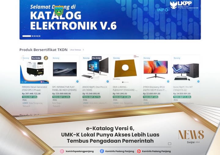 EKSPRESNEWS — Usaha Mikro Kecil dan Koperasi (UMK-K) di Padang Panjang kini memiliki akses yang lebih luas terlibat pengadaan barang dan jasa pemerintah. Kehadiran e-Katalog versi 6 membuka kesempatan bagi pelaku usaha lokal menawarkan produk mereka.