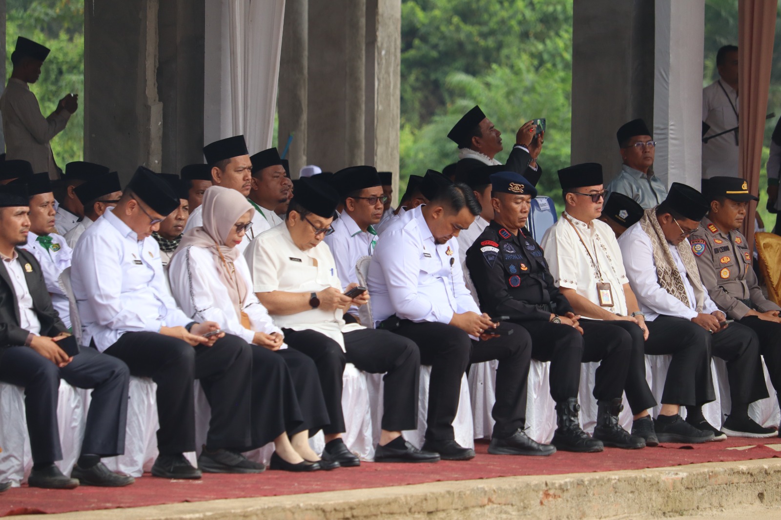 Dengan mengenakan busana bernuansa nasional dan religius, Kepala Kantor bersama jajaran Forkopimda Kabupaten Dharmasraya, para santri, ustaz, dan tokoh masyarakat tampak khidmat mengikuti jalannya upacara. Suasana penuh haru dan kebanggaan terasa ketika lantunan shalawat bergema, menggugah semangat cinta tanah air yang berpadu dengan nilai keimanan.