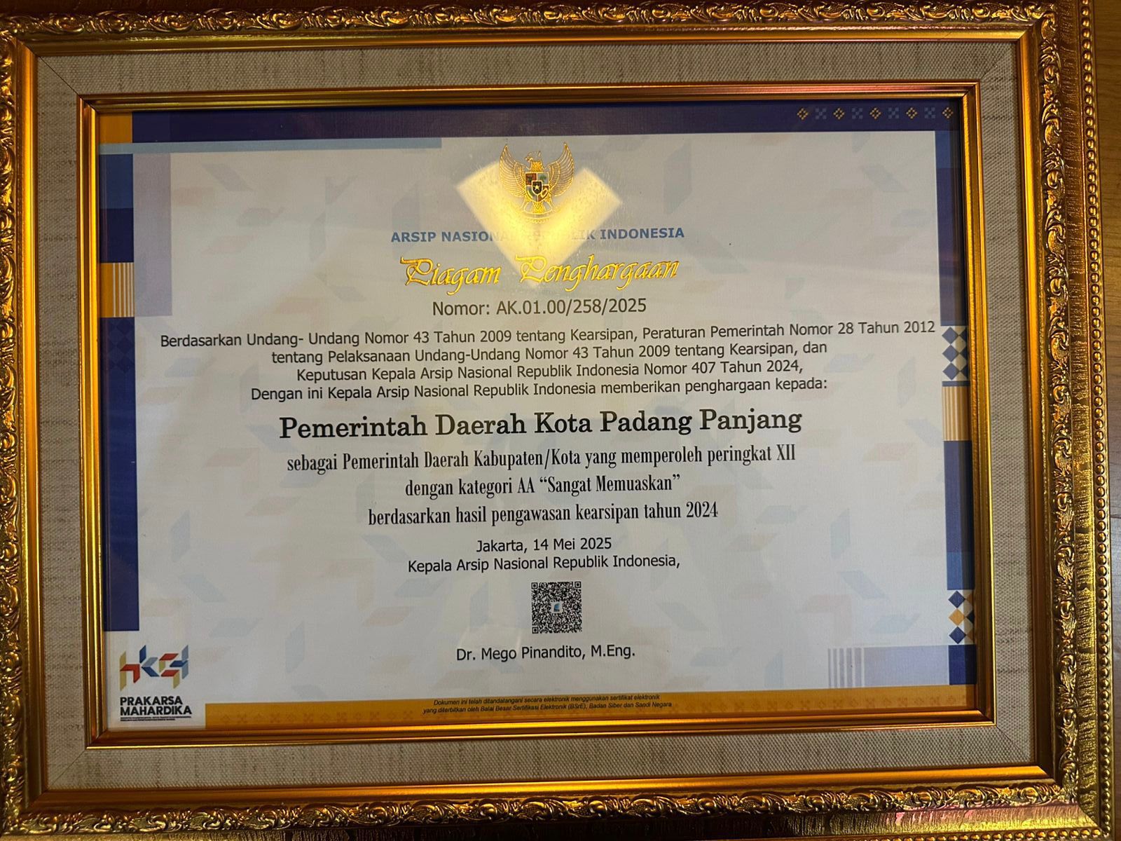 Padang Panjang meraih nilai 91,51 kategori AA (Sangat Memuaskan) — predikat tertinggi yang menunjukkan kualitas sistem kearsipan yang efisien, transparan, dan berbasis digital.