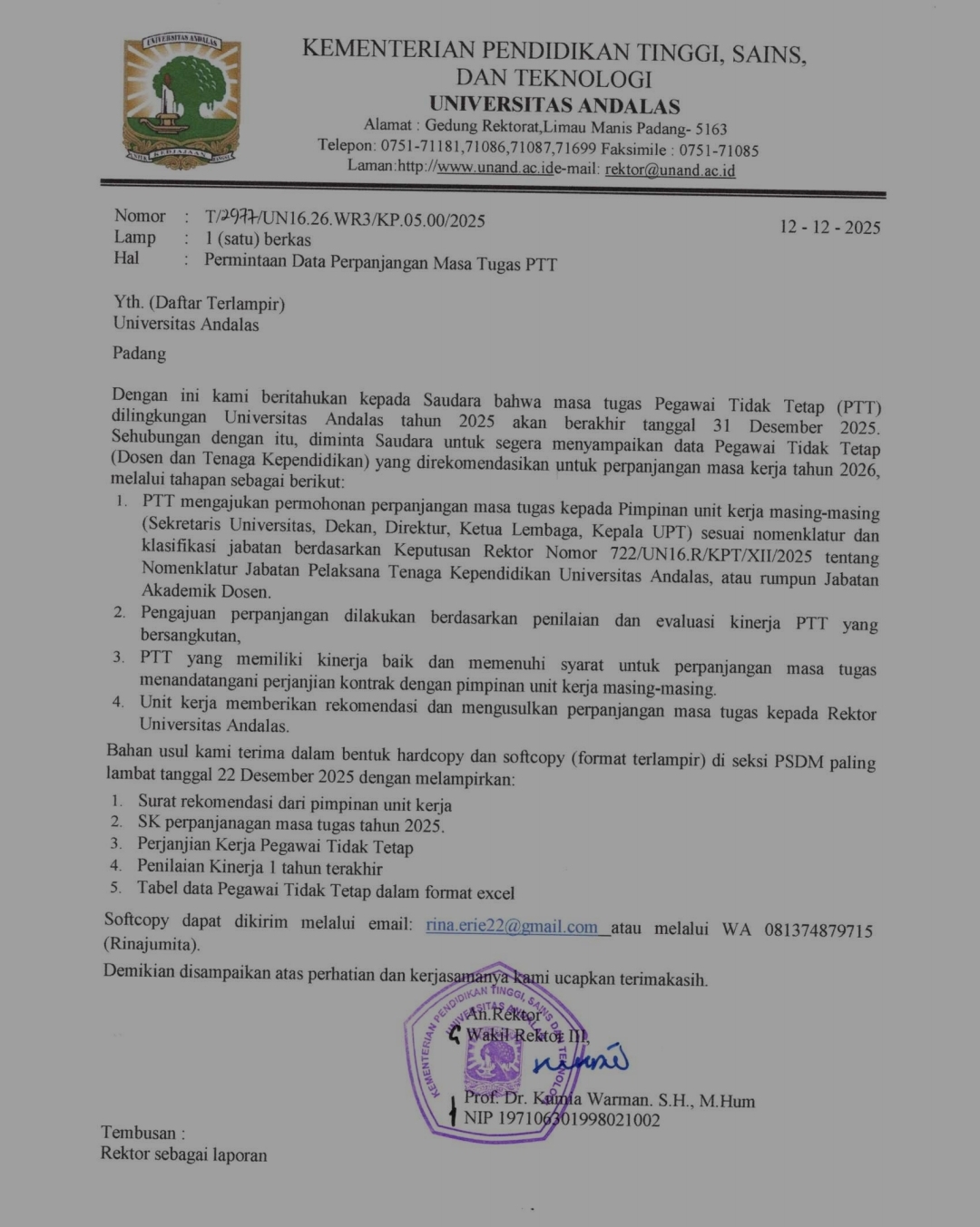 EKSPRESNEWS – Muncul surat permintaan data kepegawaian Tenaga Kependidikan (Tendik) Pegawai Tidak Tetap Universitas Andalas (Unand) Padang. Dikarenakan sudah habis masa kontrak, pihak rektorat melalui Wakil Rektor III meminta data Perpanjangan Masa Tugas PTT.