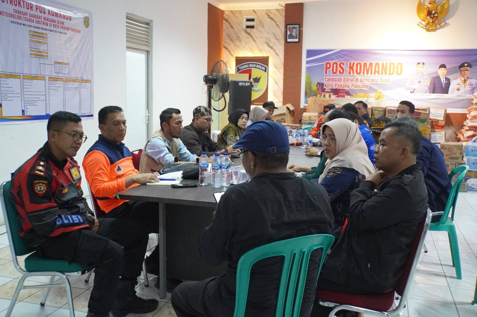 PADANG PANJANG, EKSPRESNEWS.COM — Memasuki satu pekan pascabencana banjir bandang dan longsor yang melanda beberapa wilayah di Kota Padang Panjang, Pemerintah Kota kembali menggelar rapat evaluasi untuk memastikan seluruh proses penanganan darurat berjalan optimal dan terkoordinasi. Rapat dipimpin Wakil Wali Kota, Allex Saputra, Kamis (4/12/2025) malam di Posko Tanggap Darurat Bencana, Markas Koramil 01/PP.