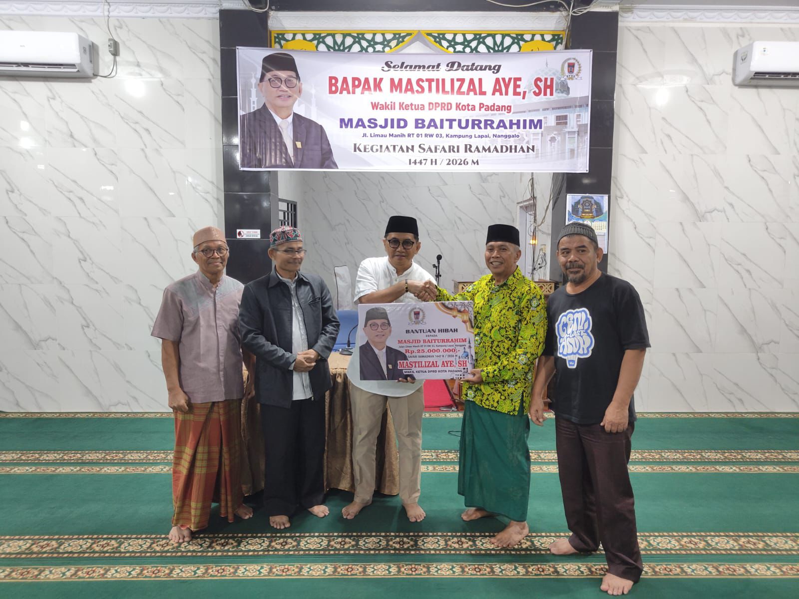 Pada Minggu (1/3/2026), Wakil Ketua DPRD Kota Padang, Mastilizal Aye, melaksanakan safari di Masjid Baiturrahim, Kampung Lapai, Kecamatan Nanggalo. Dalam kunjungannya, Mastilizal menyerahkan dana hibah sebesar Rp25 juta dari Anggaran Pendapatan dan Belanja Daerah (APBD) Kota Padang yang diperuntukkan bagi operasional dan pengembangan masjid tersebut.