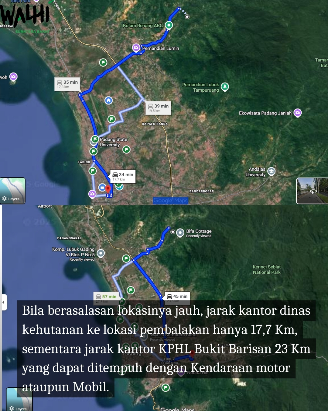 EKSPRESNEWS – Wahana Lingkungan Hidup Indonesia (WALHI) Sumatera Barat merilis temuan terbaru hasil analisis citra satelit yang menunjukkan kerusakan serius di Hulu Daerah Aliran Sungai (DAS) Air Dingin, Kota Padang. Analisis ini mengidentifikasi sedikitnya 15 titik aktivitas ilegal logging yang berada di dalam kawasan hutan lindung dan kawasan konservasi Suaka Margasatwa Bukit Barisan.